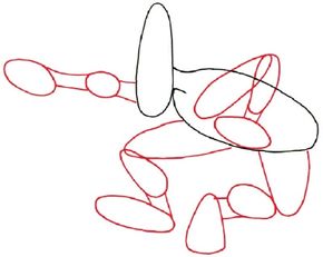 Draw the legs with U-shaped and egg-shaped figures. Show the feet as an oval and a rounded triangle. Form the ankles with two short lines.